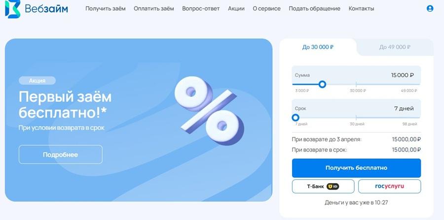 МФО Веб-займ предлагает оформить микрозайм онлайн с быстрым доступом через личный кабинет. Клиентам доступны суммы до 30 000 рублей сроком до 30 дней, а первый займ можно получить без процентов при своевременном возврате.