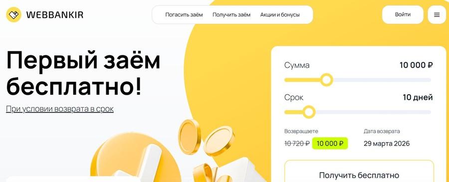 МФО Webbankir предоставляет займы гражданам от 20 лет на сумму до 30 000 рублей сроком от 7 до 30 дней. Максимальная ставка  до 0,8% в день. Для оформления займа необходимо зарегистрироваться и получить доступ к личному кабинету.